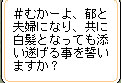 2008/03/23,20:42:10,月下老人 結婚の儀式は終了しました。続いてあなた達の幸せ宣言を大声で行ってください。